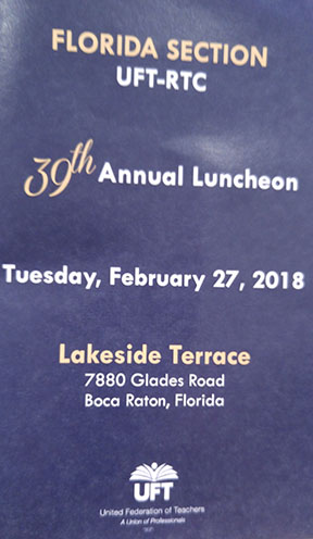Ken Goodfriend, the UFT-RTC Florida Coordinator of Services and Sections, welcomed us to the 39th Annual Florida RTC Luncheon. The tables were hosted by NYSUT Member Benefits among others. The legislation coming before the Florida legislators can have impact on our way of life and the lives of our brothers and sisters in organized labor in Florida. Our Florida AFL-CIO and the Florida Education Association will be providing the lead on these Florida issues and no doubt will be asking everyone to make phone calls to our local legislators or sign online petitions.